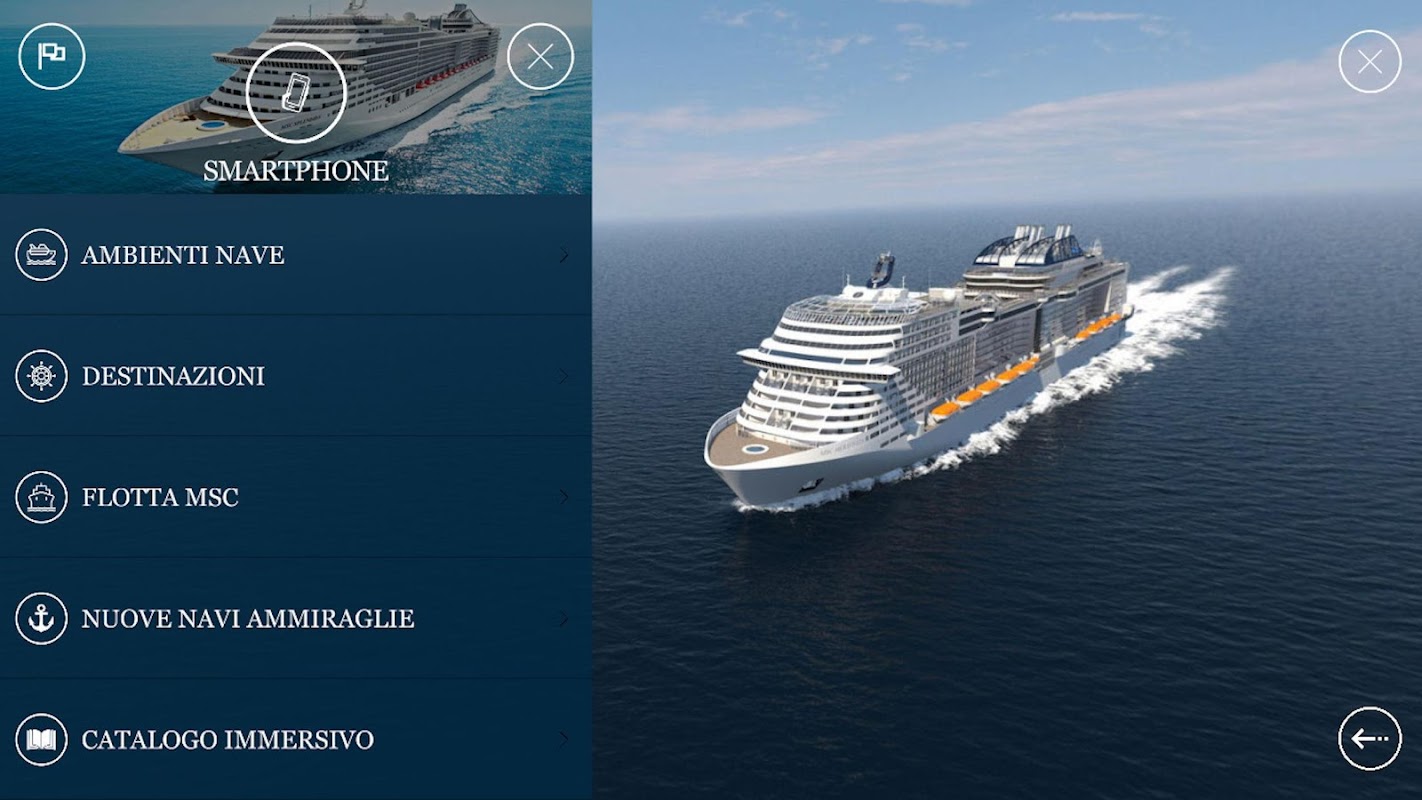 與MSC360EXPLORE用戶將能夠通過智能手機,平板和/或紙板,以顯示MSC世界,具有視頻內容和渲染環境中相對於MSC 360°,對於環境,如船餐飲和池,到目的地和遊覽等...