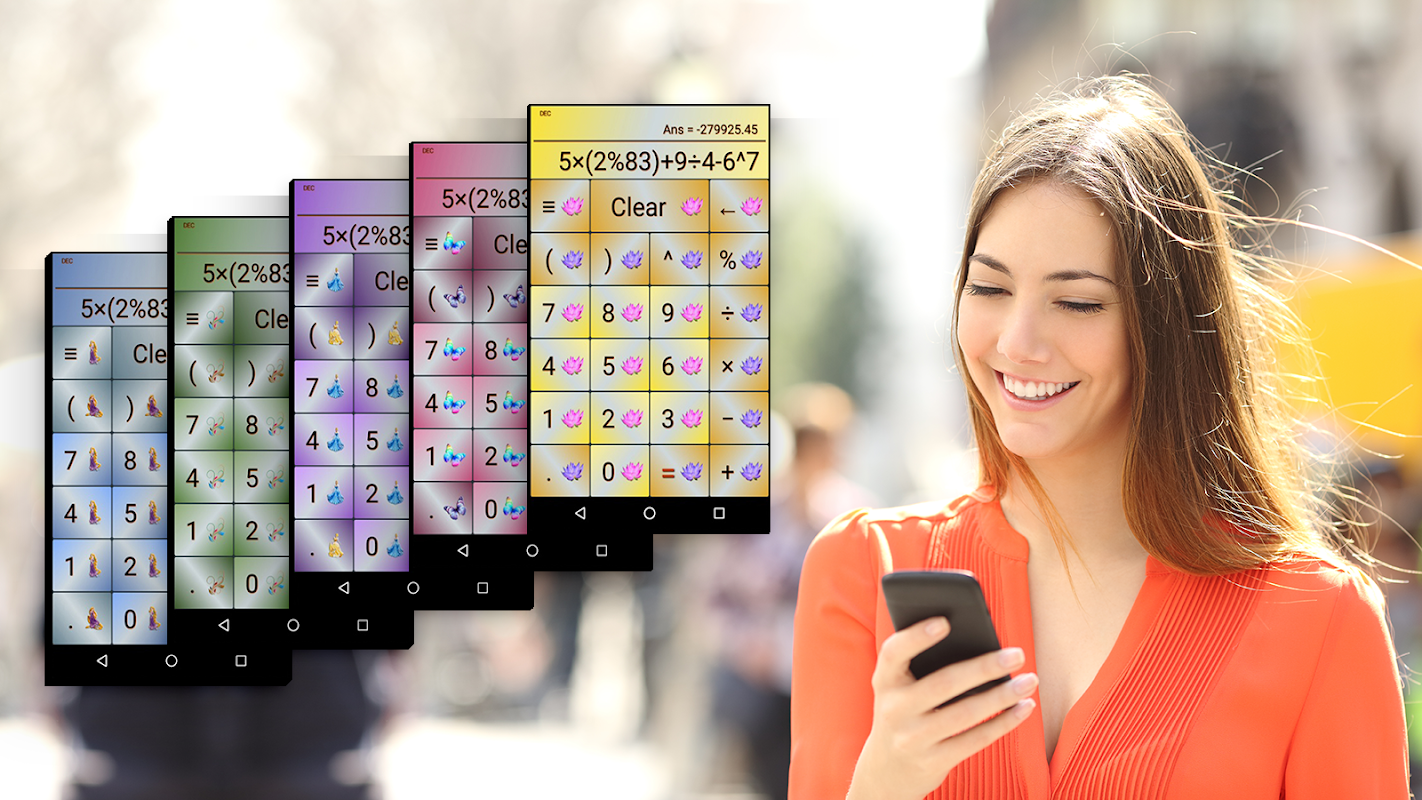 自動檢查並糾正錯誤,不是在谷歌Play商店提供的其他計算器更加時尚,款式多計算器包含了五種不同的顏色藍色,粉紅色,紫色,黃色和綠色。該計算器還包含六個不同的圖片/照片花香,跳舞娃娃,可愛的娃娃,熊貓,花與蝴蝶,一個選項也為誰不喜歡上的按鈕上方圖片或圖像這些用戶給出的,這些用戶可以選擇所有無圖像。五種不同的字體或文本尺寸給出了用戶滿意度,用戶可以根據他/她需要改變字體和文字大小。