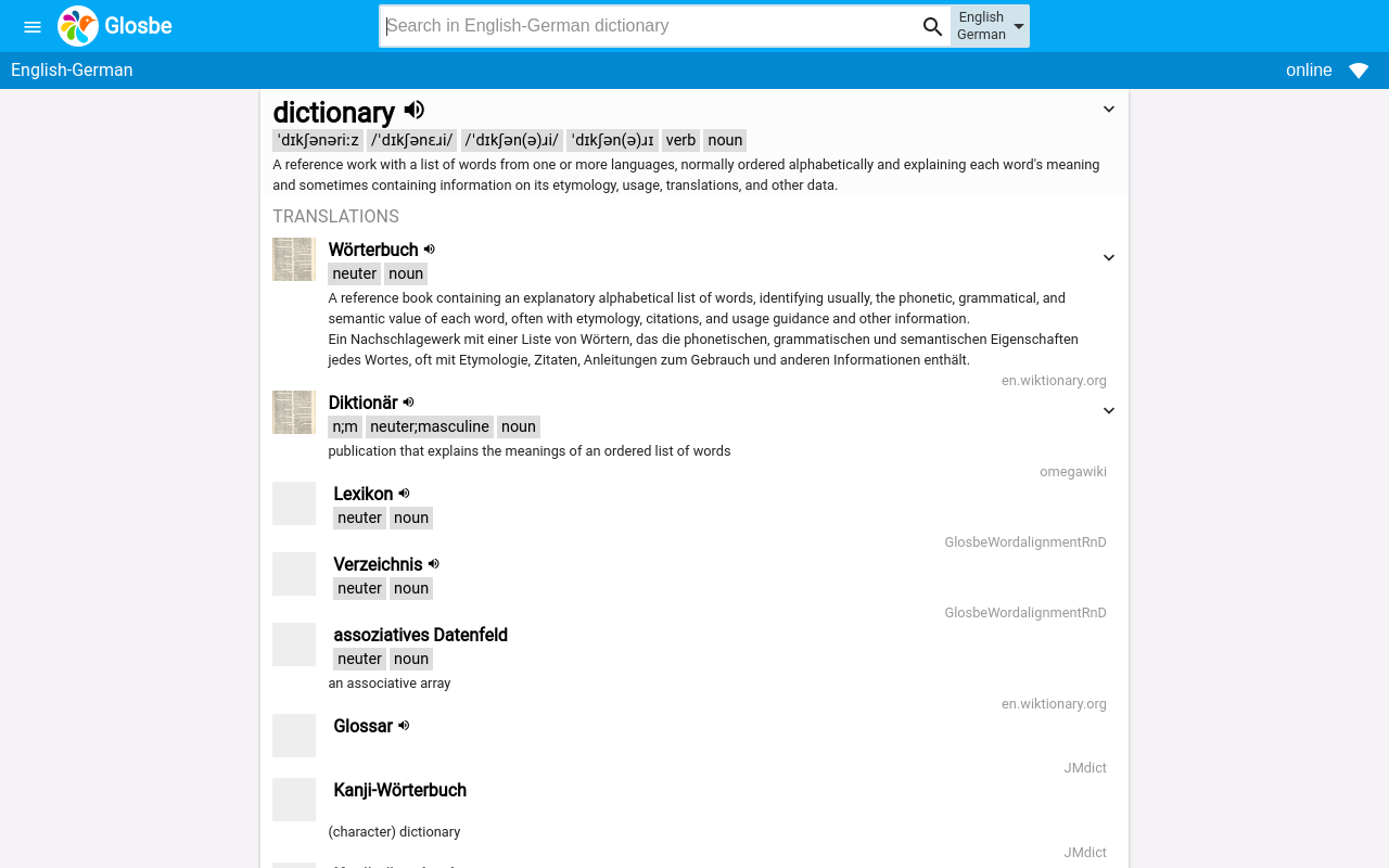 glosbe是一個多語種的詞典。它涵蓋了所有的語言,是由社區開發,就像維基百科。和作品包括在線和離線!