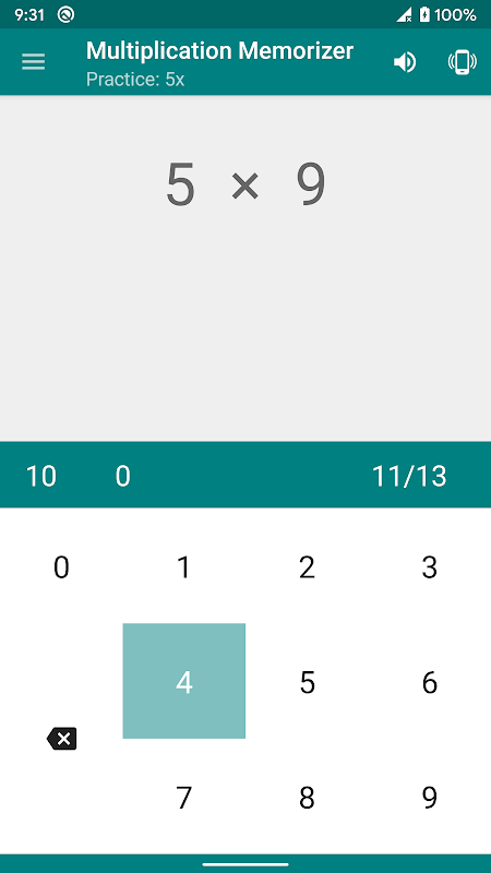練習是您測試乘法記憶的地方。問題是隨機產生的。輸入答案的位數是您的工作(沒有多項選擇)。跟踪並保存每個乘法事實的正確和錯誤嘗試次數。在每個會話的末尾列出了不正確的問題,您可以選擇重複所有問題,僅在不正確的嘗試上重複,或將所有問題一起洗掉。