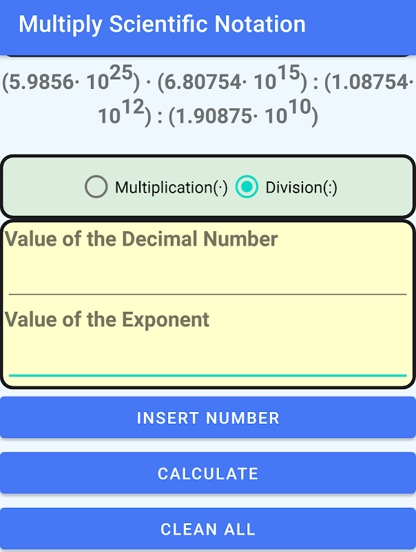 當用戶介紹數字時,應用程序將執行操作。要相乘,我們將所有十進制數相乘並加上指數。要進行除法,我們將十進制數相除並減去指數。
