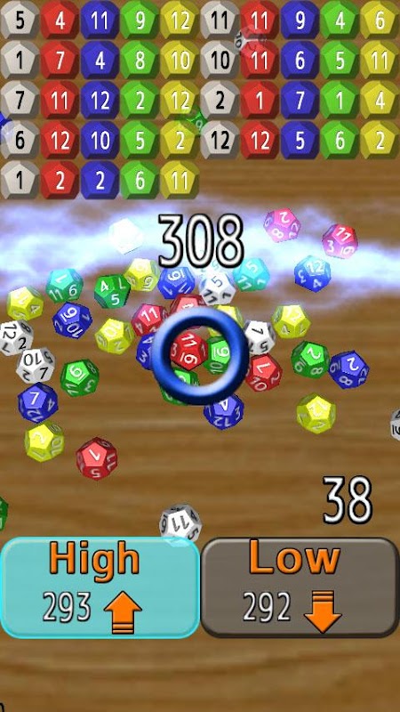 出た目の合計を予測または計算し、表示されている数値より大きいと思ったら「High」、小さいと思ったら「Low」を押します。60秒間で何問正解出来るかというゲームです。