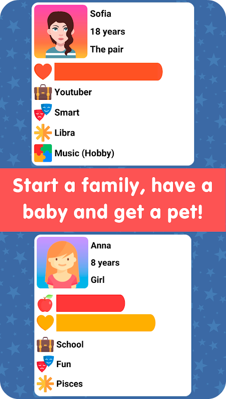 Have you dreamt of becoming a rapper or a rocker? Or maybe you like Korean pop music? In this game, you can become anyone you want! Besides, you can also start a relationship, family, have children or get pets. But let's start from the very beginning: