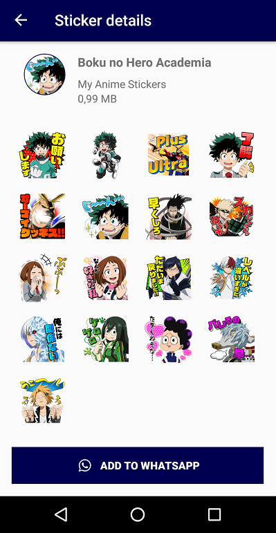 我的動漫貼紙1:Anime Reactions,1Yanime,Acchi kocchi,Akama ga kill,Angel Beats,Anohana,進擊泰坦,Bang dream,Barakamon,Bleach,Blend S,Boku no Hero Academia,bungou,Cardcaptor Sakura,Charlotte,Chuunibyou,火影忍者Dagashi kashi,One Punch Man,Danshi koukousei no nichijou,死亡筆記,龍珠,兒子悟空