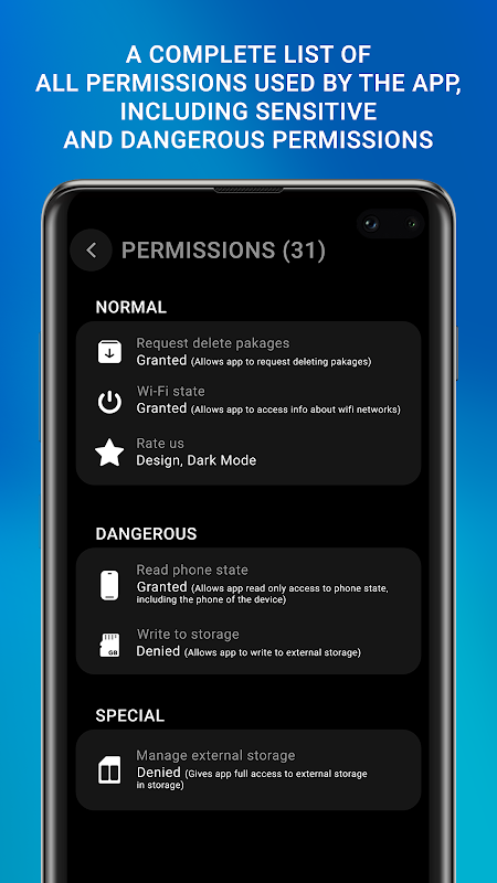 • READ_EXTERNAL_STORAGE/WRITE_EXTERNAL_STORAGE - 查找要安裝/刪除的 APK 文件