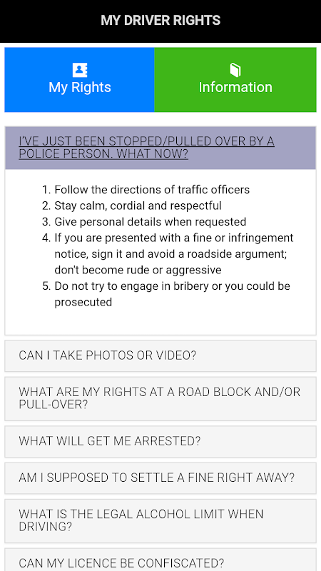 This app contains quick, handy information about your rights as a driver for easy access if you find yourself in a situation where knowledge is the key to a successful outcome.