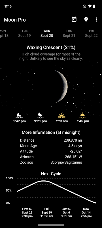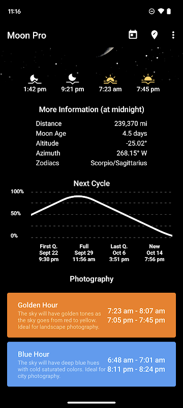 My Moon Phase 是追踪農曆的最佳應用。它採用時尚的深色設計,可以輕鬆查看當前月亮週期、月出和月落時間等信息以及下一次滿月時間等附加信息。如果您對月球攝影感興趣,還可以了解黃金時段和藍色時段的時間,以便拍攝最美麗的照片。