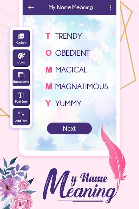 Use My Name Meaning app to create an amazingly creative meaning of names. My Name meaning Application helps you find out what's behind your name and make a picture with the meaning of your name.