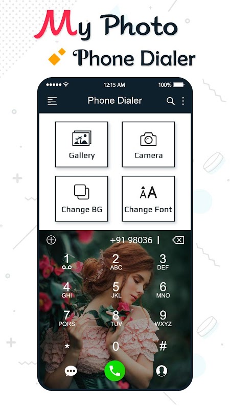 Place a photo of your choice to make a dial screen of your own, There are call logs, contacts, dial pad with photo of your choice and settings to customize it..