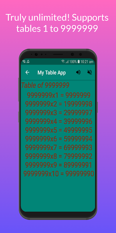 您的新數學老師就在這裡!我的表格應用程序,可在不到一秒鐘的時間內生成1至9999999個數學乘法表。生成無限的乘法表。學習數學表變得容易。
