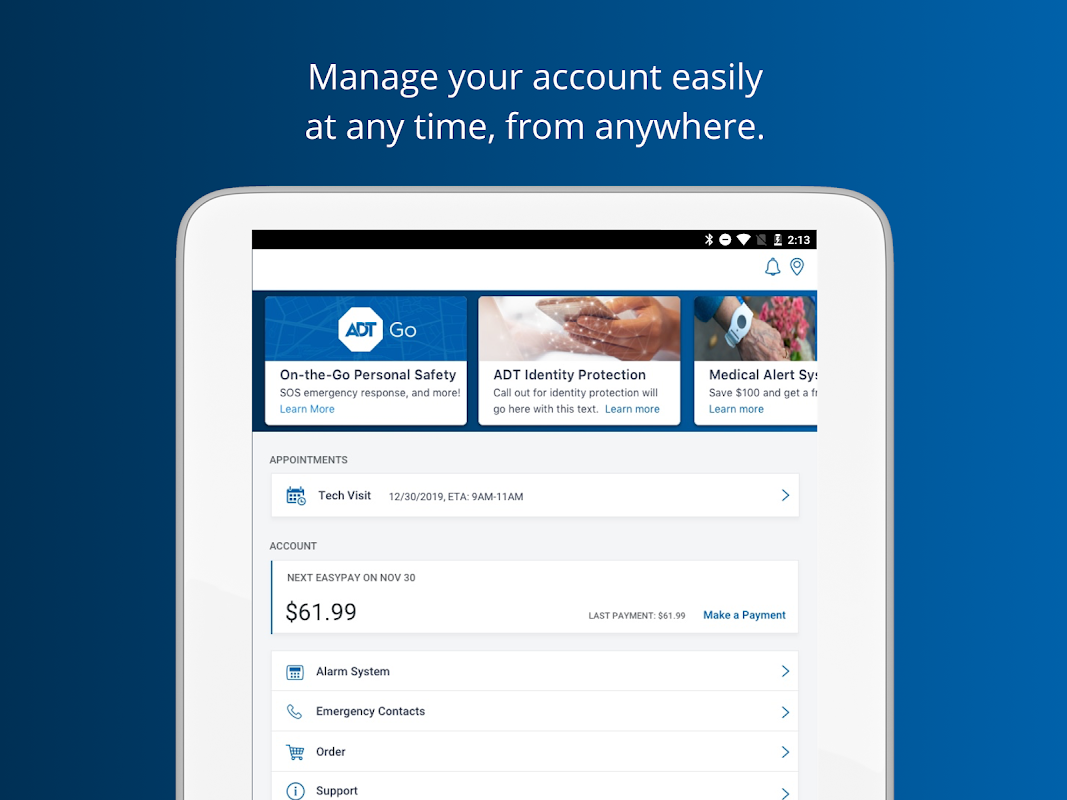 ADT是美國排名第一的智能家居安全提供商。隨時隨地管理您的帳戶,提供有用的功能,例如我們的互動式犯罪地圖,賬單支付,EasyPay註冊以及其他有用的工具,讓您的生活更輕鬆。對智能家居技術感興趣?您還可以通過“新功能”部分了解新產品和功能的最新信息,這樣您就可以保持家的智能。