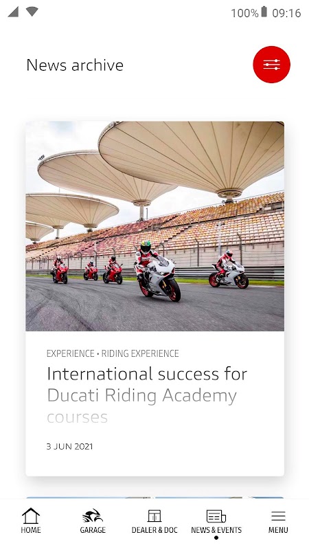 在您的车库中,您可以管理所拥有的摩托车,查询可用文档,配置您梦寐以求的摩托车并与朋友们分享,或者发送给您的杜卡迪特许经销商。
