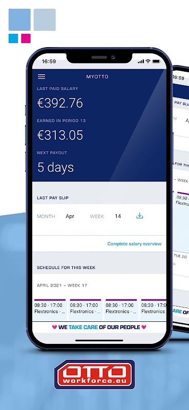 在 OTTO Work Force,我們關心我們的員工!這包括讓您的日常工作盡可能簡單。在荷蘭開始為 OTTO Work Force 工作;然後下載 myOTTO 應用程序,讓您在手機上擁有所需的一切。有荷蘭語、英語、波蘭語和斯洛伐克語版本。