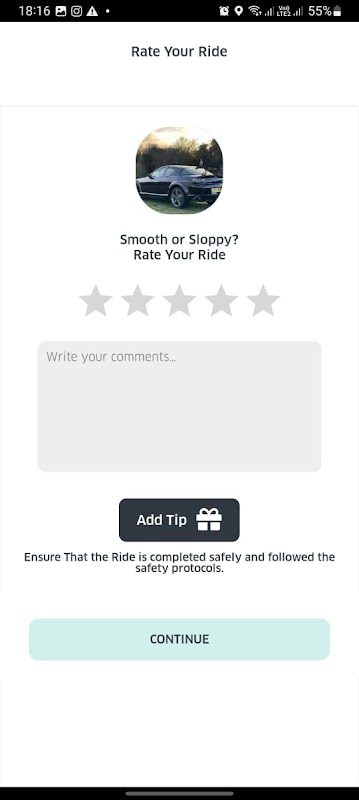 -After every ride, you can submit a rating along with comments. You can also let your driver know you appreciated your experience by adding a tip for e app.