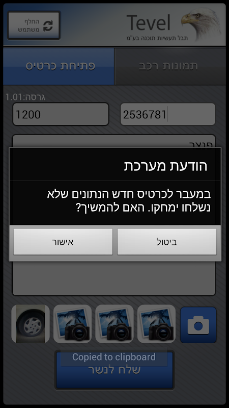 The application enables the user to upload text descriptions of vehicle's faults as well as pictures, to the Tevel Software LTD. "Nesher" database.