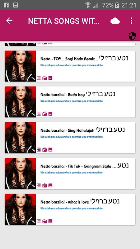 APKPure 使用簽章驗證功能,確保為您提供無病毒的 Netta Barzilai's songs 2019 WITHOUT NET APK 下載。