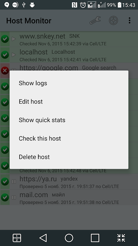 主機顯示器接口支持通知,窗口小部件,振動,聲音和LED指示。您可以指定一個條款通知 - 例如總是,或者只有當錯誤,或者如果狀態改變等。此外,您可以通過電子郵件設置通知。應用程序可以保存,展示和導出日誌以各種格式,並提供統計功能。