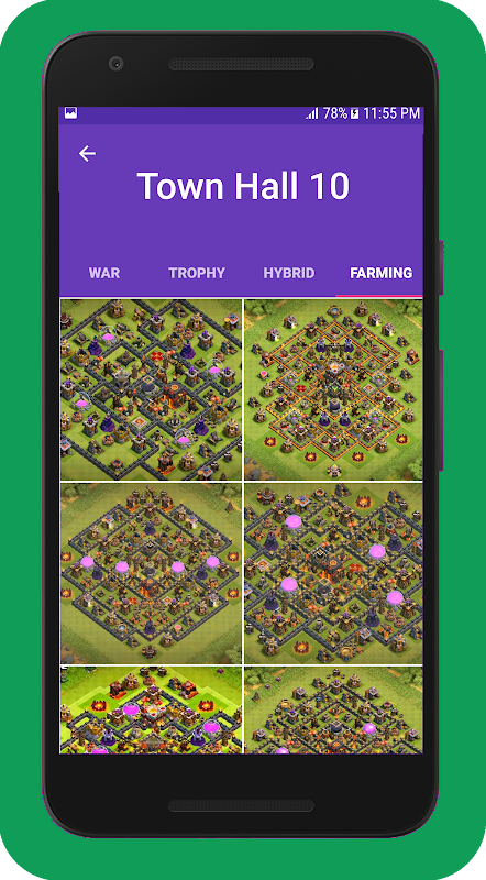 This is an Offline app that contains New Defensive Base Maps of COC village layouts from Town Hall 1 to Town Hall 11 with 4 category War, Trophy, Hybrid and Farming.