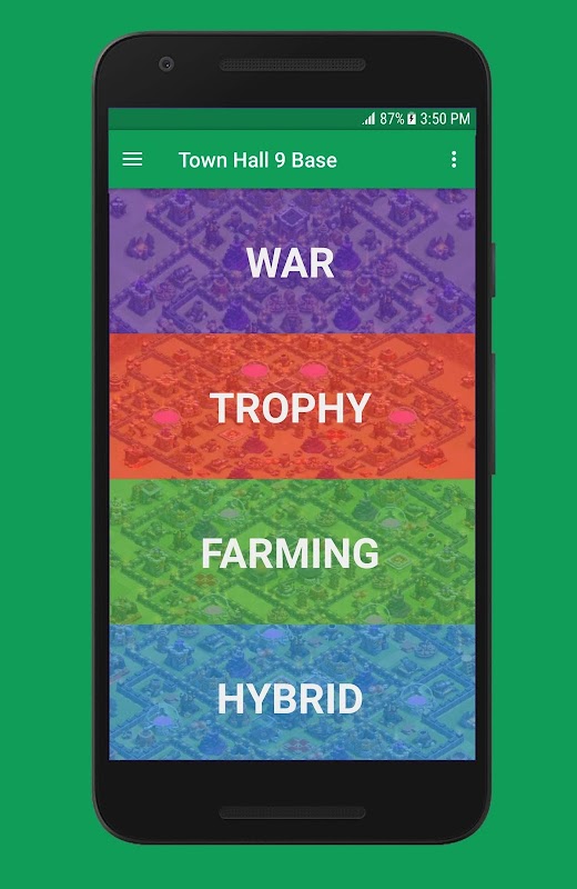 It contains Maps from Town Hall 9 with three category War, Trophy and Hybrid.