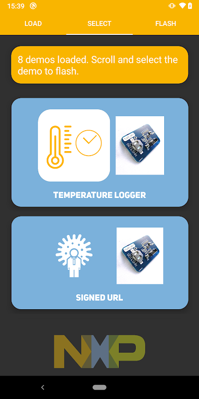 您可以從恩智浦提供的演示列表中進行選擇,也可以在應用程序中製作您自己的演示。選定的固件映像將通過 NFC 接口發送到 NHS31xx IC。下載完成後,第二階段引導加載程序不再可用:IC 被復位並執行新的應用程序。