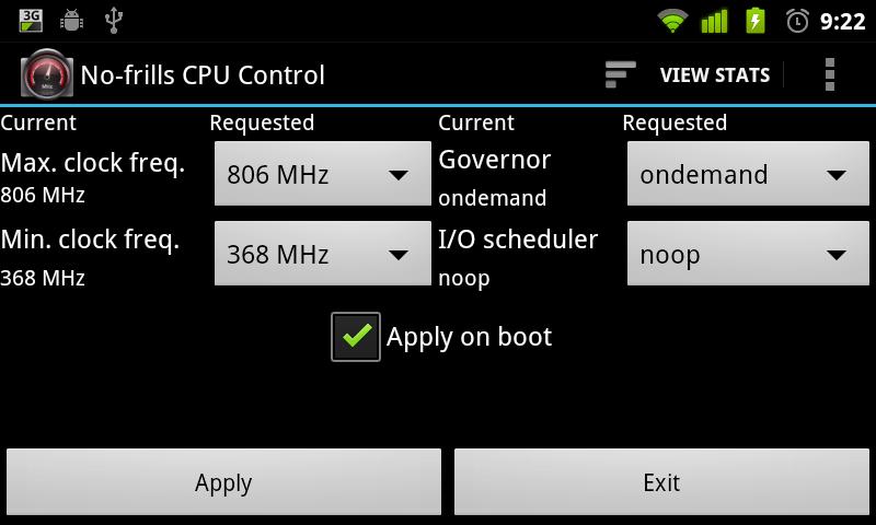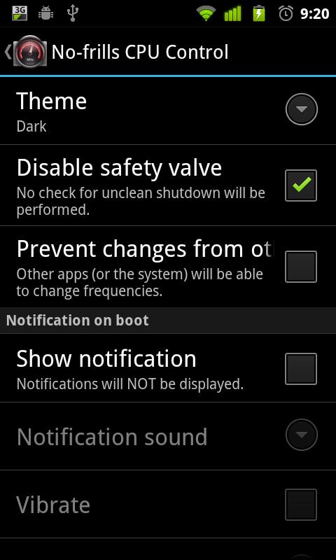 Be wary of the frequencies you select! Your phone may lock or become unresponsive if it doesn't like extreme values, but -hey- better safe than sorry: even though No-frills CPU Control allows you to choose if you want to apply the settings on boot, it comes with an extra "safety valve" too! If the device doesn't shut down (or reboot) in a clean way, it will not apply the settings, avoiding those nasty boot-loops you may have had with other overclocking apps. Please keep in mind that apps like QuickBoot are as quick as they are unsafe…