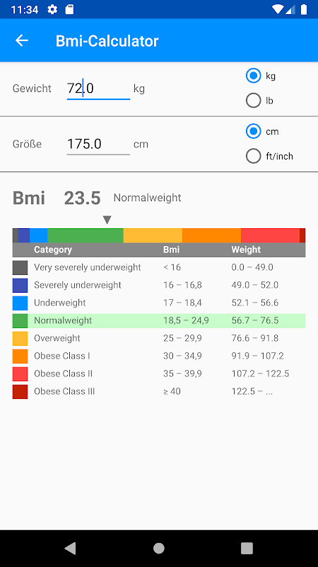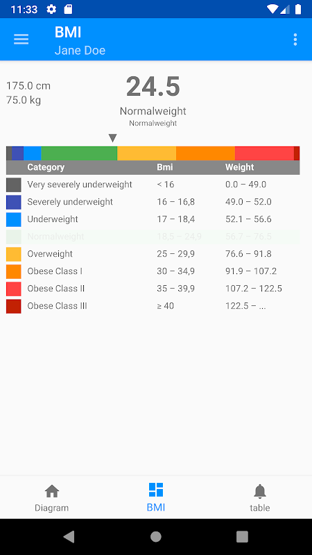 The weight diary gives you the opportunity to record and display your weight over any period of time. Daily weighings are stored in a table and can be provided with short notes. This makes it possible to understand reasons for weight fluctuations and counteract them accordingly. The body measurement index, which is determined for your measurements, gives you help with the health classification of your weight.