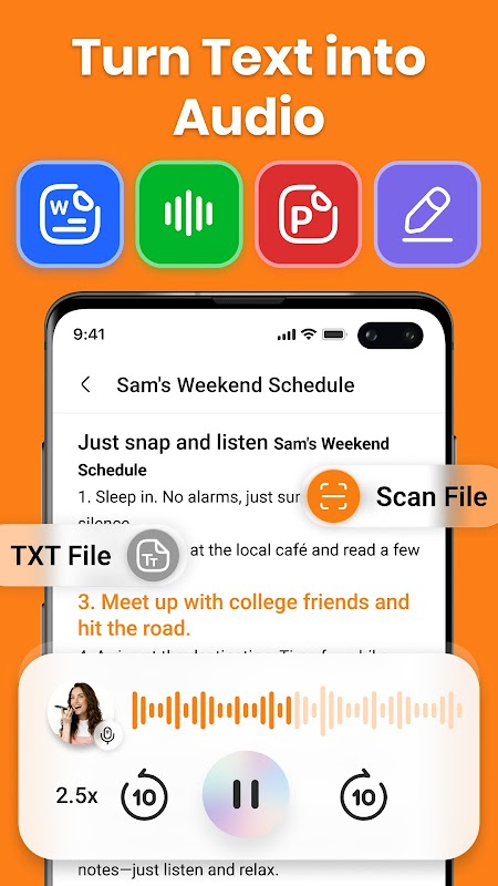 -一鍵播報:支援 TXT、PDF、Word、圖片、掃描文件等格式的音訊直接轉碼。