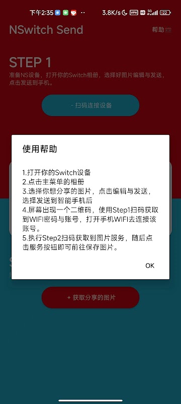 1.啓動你的switch設備後,打開相冊,選擇要分享的圖片,選擇發送與編輯,發送到智能設備,出現二維碼,打開本應用,執行Step1,掃碼獲取WIFI密碼與賬號。連接到該熱點。