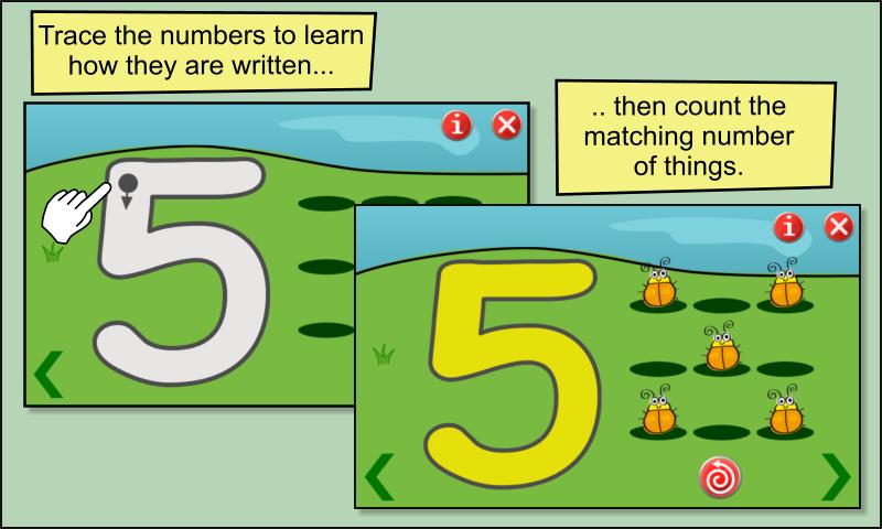 Children love to copy and count along, so the main activities each have a level where the numbers are spoken as items are counted, helping children become familiar with the number names and their order.
