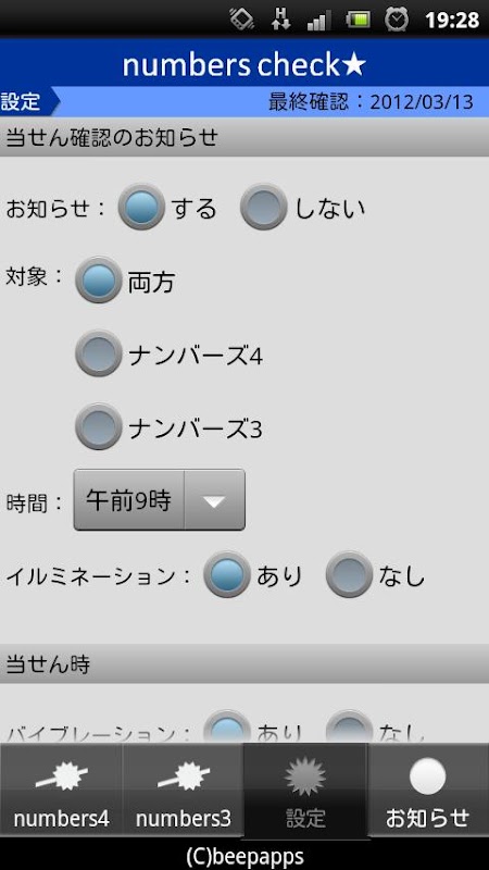 numbers check★は、ナンバーズ4(numbers4)とナンバーズ3(numbers3)の購入回数と数字の管理、当せん確認を行う無料のアプリです。ナンバーズ宝くじの抽選日翌日に当せん確認をお知らせし、当せんしているかどうかの確認をみずほ銀行や宝くじ公式サイトの情報を使って行います。また、好きな数字と嫌いな数字を登録して数字を予想するクイックピック機能もあり、そのまま数字を登録することができます(クイックピック機能のない、numbers check★liteもあります。必要ない方はそちらをご利用ください)。