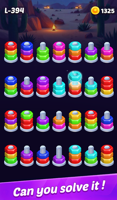 每個關卡都擠滿了一堆亂七八糟的彩色堅果拼圖。你的工作?透過將每種顏色分類到其匹配的螺栓上來匹配並堆疊螺母和螺栓。聽起來很容易?等待螺絲分揀開始!