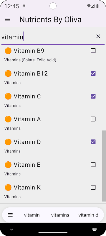 广泛的营养素数据库:访问各种营养素的详细信息,包括它们的通用名称、类别(常量营养素或微量营养素)以及在体内的作用(必需或非必需)。了解它们是水溶性还是脂溶性的,并了解它们在体内的储存机制。