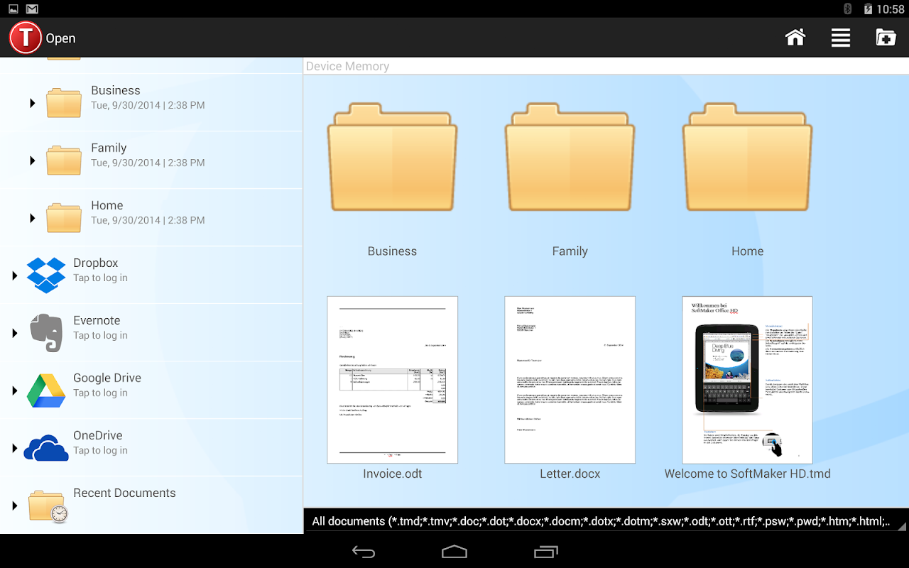 保存在本地或云中: TextMaker HD 不仅能打开和保存 Android 平板本地文档,也可以打开并保存在云中:您可以直接在 TextMaker HD 中编辑 Dropbox、谷歌云端硬盘、亚马逊 Cloud Drive、印象笔记和 OneDrive 里的文档。