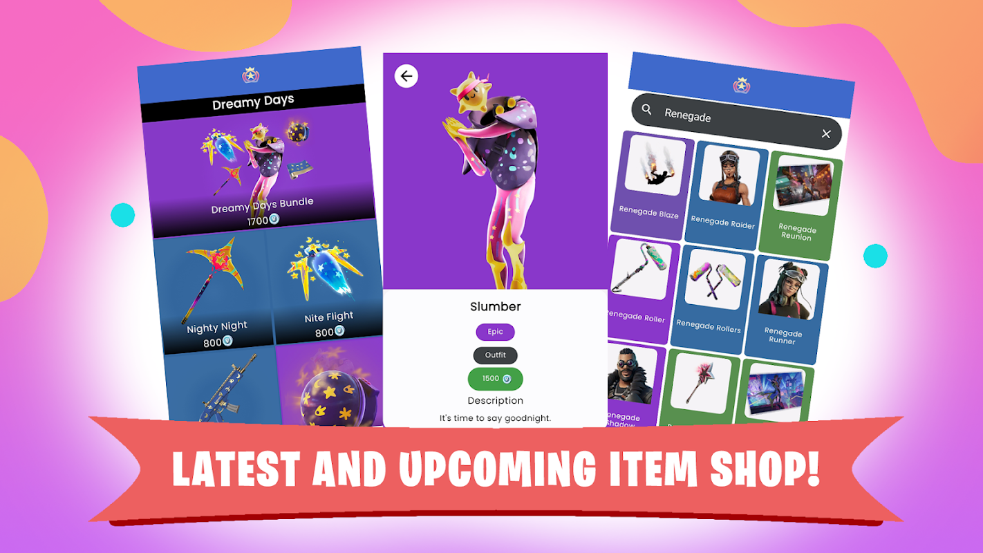 • Fortnite Companion Item Shop 和 Leaked Items: 商店列表顯示了 Fortnite:Battle Royale 中所有最新的化妝品、皮膚、鎬、後裔等。獲取有關特色商品和日常商品的稀有度、發生率和描述信息。您還可以查看 Fortnite 商店洩漏並檢查即將推出的化妝品。