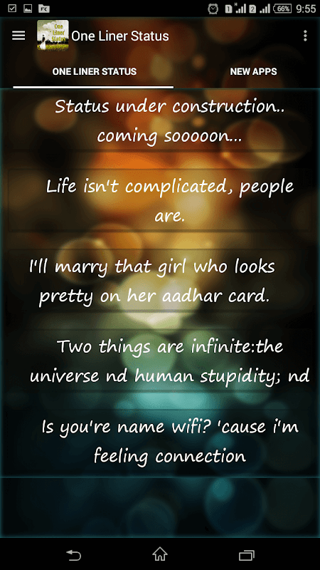 This app for Hindi English Status Messages Lover. You can share various one liner short status feeling with girlfriend,boy , loved one etc and shared to friends.These app contains short messages in english as well as Hindi .In future Sms,jokes features will be added.