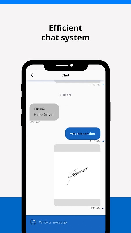 高效率的聊天系統。不再有混亂的對話。聊天模組不僅促進訊息交換,還支援檔案傳輸(高達 3MB),使駕駛和調度員保持無縫連接。此外,所交換訊息的即時狀態更新(例如,已看到/未看到)可確保每個訊息都被注意到。