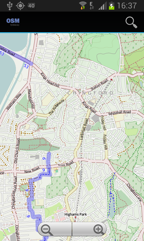 The OpenCycleMap Viewer app displays the OpenCycleMap, with the ability to search for locations. OpenCycleMap is based on OpenStreetMaps.