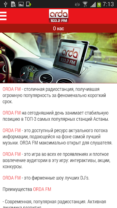 Мобильное приложение "OrdaFM" экономно расходует заряд батареи и управляется с помощью гарнитуры. Несмотря на то, что Вы едете в автомобиле или отдыхаете за городом - слушайте "OrdaFM" везде, где есть мобильный интернет. Поток радиостанции оптимизирован для прослушивания в условиях "слабого сигнала интернета".