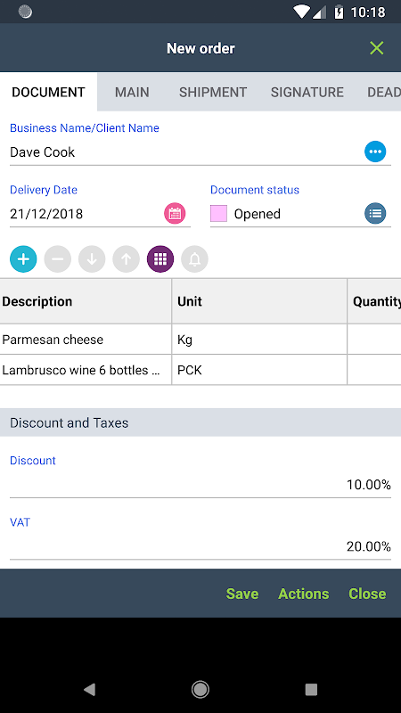 只需選擇您的客戶和具有相關數量的物品,設置折扣,只需單擊一下您的訂單即可完成並準備好以 PDF 格式發送給公司和您的客戶。