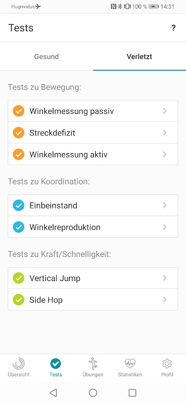Die Tests und Übungen sind in drei Kategorien gegliedert. Je nach Genesungsfortschritt