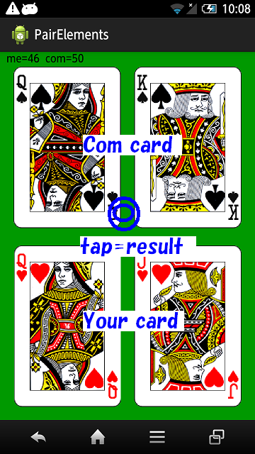 画像に説明を入れておりますので操作は分かると思います。ただ、勝負するときにカードを2枚出した状態で、カードを上にフリックすることと、カードが4枚出ている画面で画面をタップしないと判定しないところが分かりにくいかもしれません。