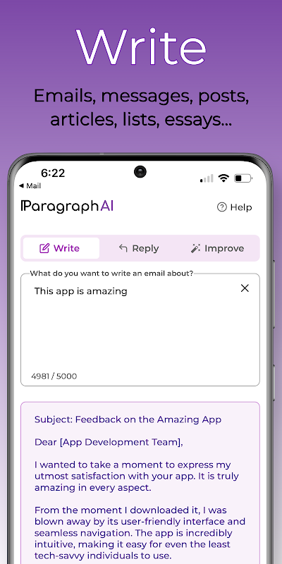 *撰寫*關於任何主題的文章、論文、電子郵件、消息、報告、文本和大綱。只需描述您希望人工智能作家創建的內容——“一篇關於麥克白的文章大綱”、“一封銷售電子郵件外展”——ParagraphAI 就會按照您選擇的格式生成文本,從短段落到詳細的文章。