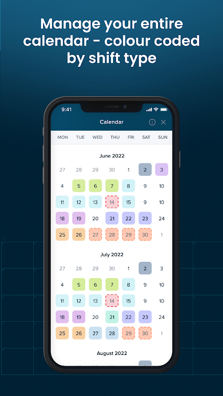 Patchwork Rota 的主頁提供了未來一周即將到來的班次的快照,因此您可以密切關注您的日程安排。您還可以在我們直觀的彩色日曆視圖中查看您的整個日程安排,並一目了然地了解您是在上夜班還是上夜班。