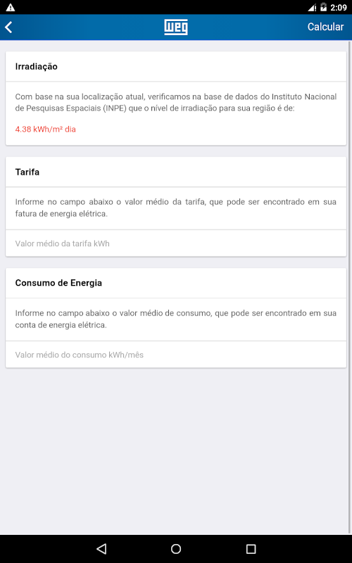 太陽能投資回收期WEG應用程序允許你來計算將採用太陽能WEG解決方案的財務回報。計算將根據您的能源法案信息,並根據您所在的地區的太陽輻射指數。