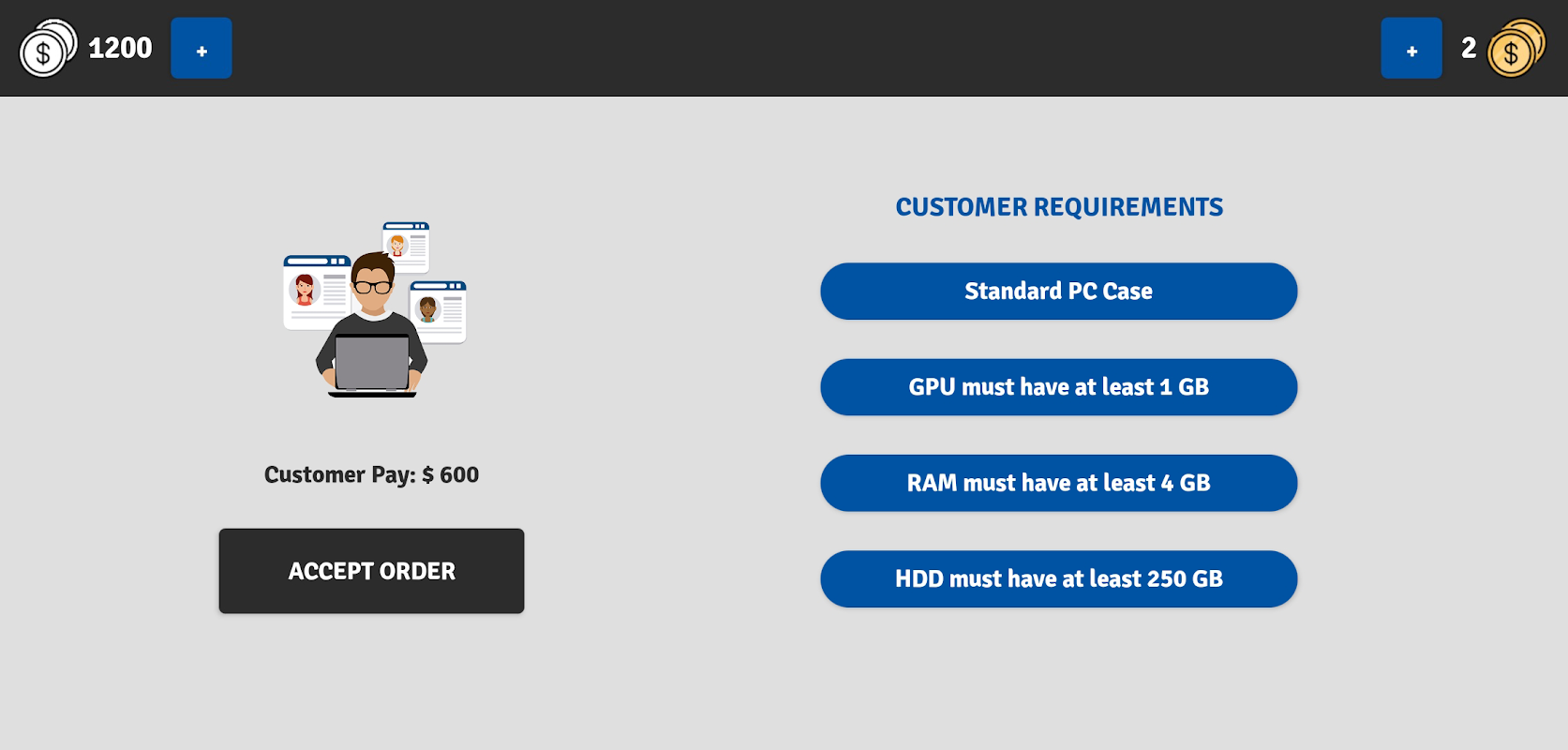 This PC Building Simulator contains two game modes. You can assemble the computer for yourself and then sell it on market, or you can build computer for customer.