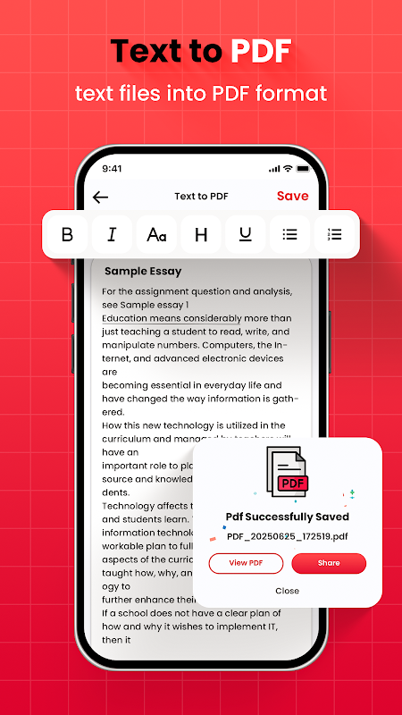 多功能的文本轉 PDF 轉換器可讓您貼上或輸入文本,套用豐富的格式(例如粗體、斜體或底線樣式),並立即將文字轉換為格式良好的 PDF。它是創建快速筆記、信件、報告或任何 PDF 格式的輸入內容的理想選擇。