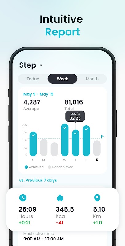透過顯示步數、步行時間、距離和消耗的卡路里的詳細圖表,深入了解您的活動量。您可以按日、週或月查看數據,以了解您最活躍的時間和運動趨勢。