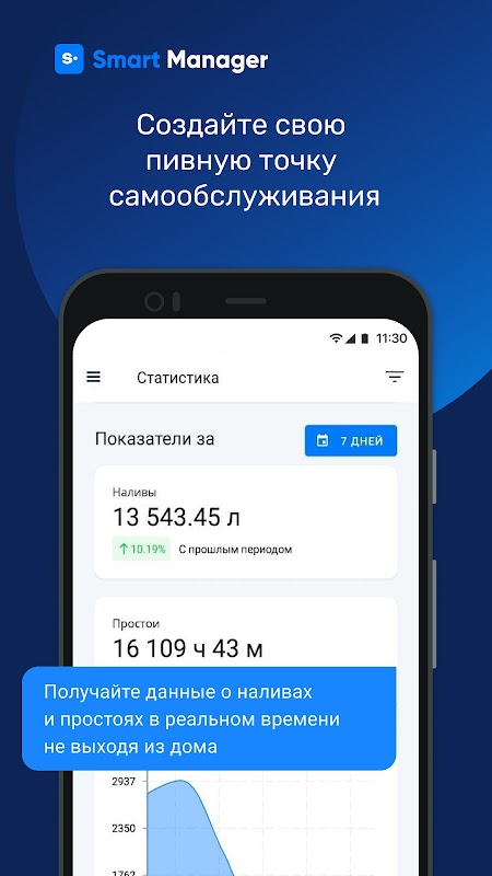 Данные в ежедневном мониторинге покажут сводную информацию по устройствам. Например, количество пустых кег или неработающих устройств. Просматривайте графики по наливам, простоям и динамику в сравнение с прошлым периодом.