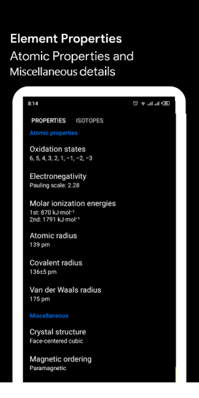 除化學元素名稱和符號外,本應用程序還包含化學元素的所有真實圖片及其電子外殼結構圖。
