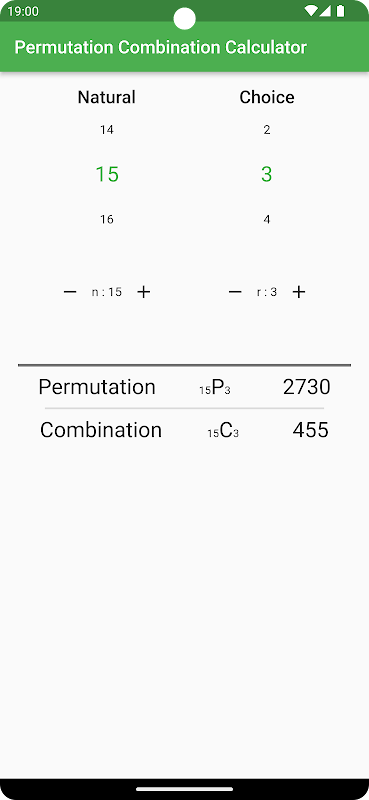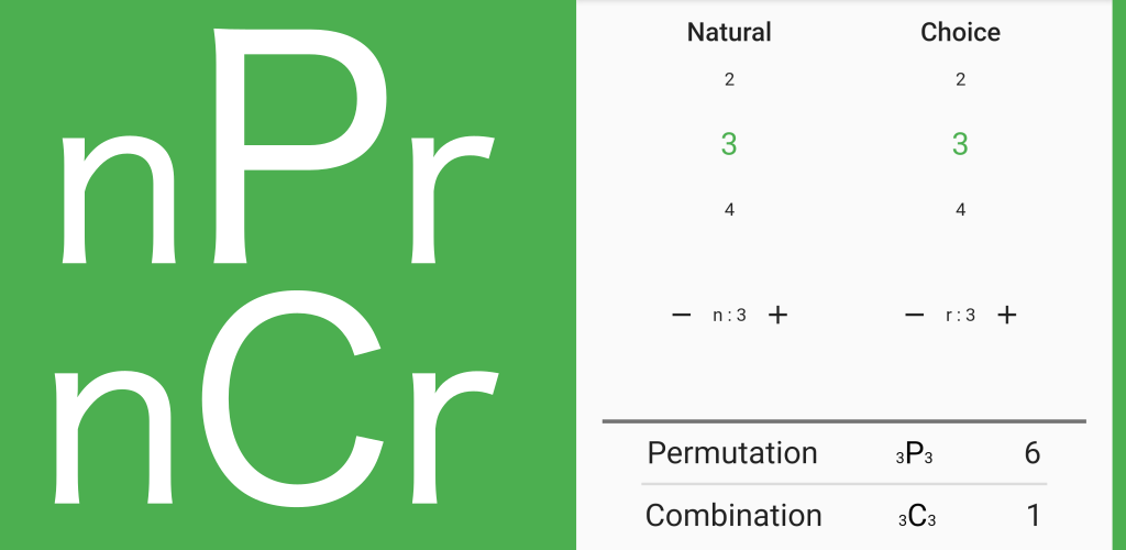 該應用程序配備了執行排列和組合計算的功能。在排列計算中,您可以找到從n個元素中選擇r個元素的情況的數量。另一方面,組合計算允許您查找從 n 個元素中選擇 r 個元素的情況數,而不管順序。